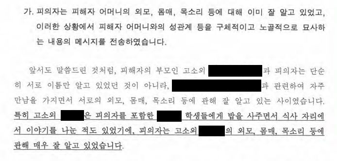 이에 저 이재성 변호사는 피해학생 부모님께 문의를 하여, 피해학생 어머니와 가해학생이 평소 자주 만남을 가지면서 가해학생이 피해학생 어머니의 외모 등을 이미 잘 알고 있는 상황이라는 점을 파악하였고, 이를 근거로 가해학생이 피해학생 어머니의 외모 등를 구체적으로 상상하면서 성적 패드립을 하였음을 주장하였습니다.