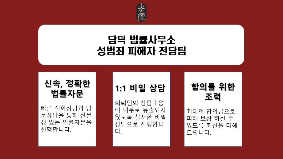 현재 성범죄 피해를 입은 직후의 상황에서 담덕 법률사무소 성피해자 전문 변호사는 피해자의 상황을 검토하여 앞으로 어떻게 사건을 진행에 있어 최선의 방향을 제시해 드릴 수 있습니다.