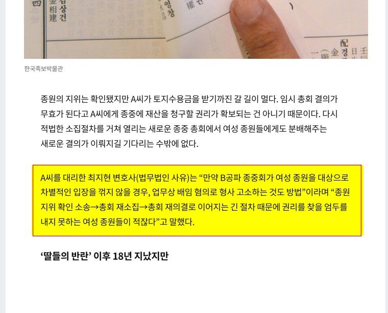 2005년 대법원 전원합의체 판결로 여성들도 당연히 종원으로서의 지위를 인정받게 되었으나, 이후에도 수 많은 종중들아 자신들은 '종중유사단체'라는 궤변으로 여성들의 종원으로서의 권리를 인정하지 않았습니다.