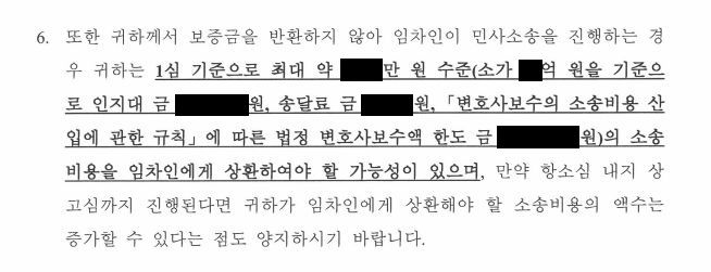 ② 민사소송을 진행될 경우, 임대인은 임차인에게 소송비용으로 인지대, 송달료 및 법정 변호사보수액 한도에 따른 변호사보수를 상환하여야 할 가능성이 있다는 점