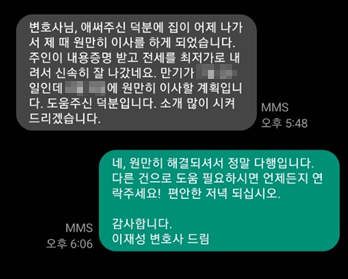 이후 위 내용증명을 받은 임대인은 곧바로 전세보증금을 최저가로 내려 후속 임차인을 구했고, 후속 임차인으로부터 받은 보증금으로 기존 임차인의 보증금을 지급하여 저의 의뢰인인 기존 임차인께서는 보증금 전액을 회수하고 새로운 집으로 원만히 이사할 수 있었습니다.