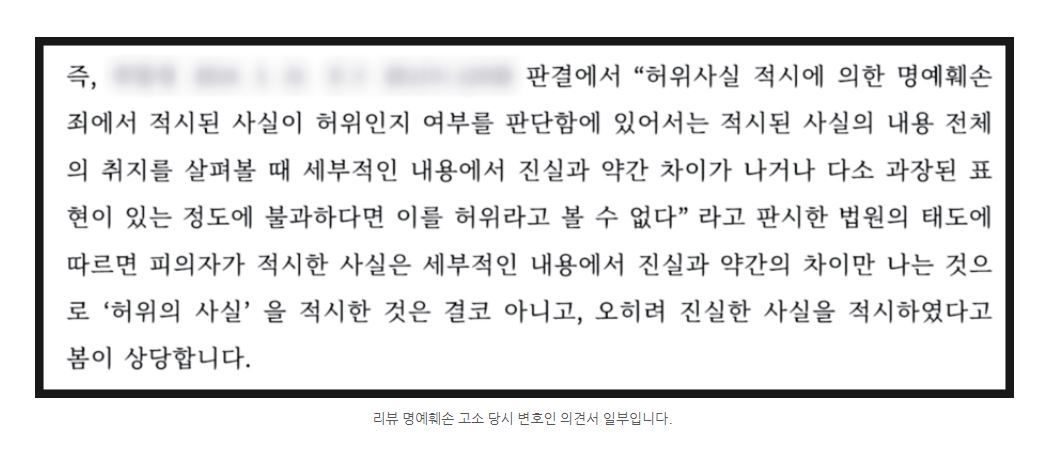 때문에 당시 리뷰 작성 시 감정이 격해져 세부 내용에서 일부 과정 된 내용이 있더라도 '진실한 사실'로 판단될 수 있다는 것이지요.