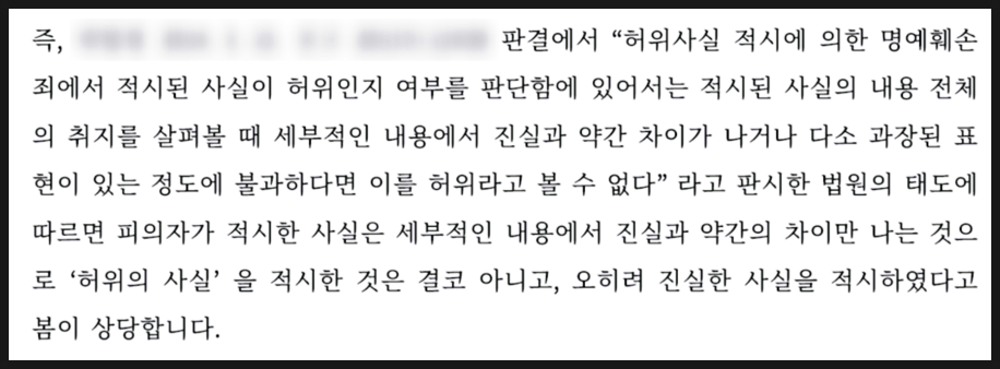 이 부분은 저희가 다른 사실 적시 명예훼손 사건에서 1,2심 벌금형/집행유예가 나온 사건을 대법원에서 무죄를 이끈 사례를 보유할 만큼,