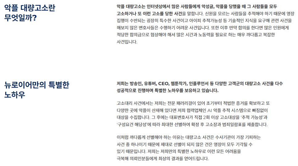 이에 의뢰인분은 매일같이 쏟아지는 악플에 정신적 피해는 물론이고 작품활동에도 심각한 지장을 받게 되어 부득이 법적 조치를 위해 집단고소 전문 저희 뉴로이어를 찾아주셨습니다.