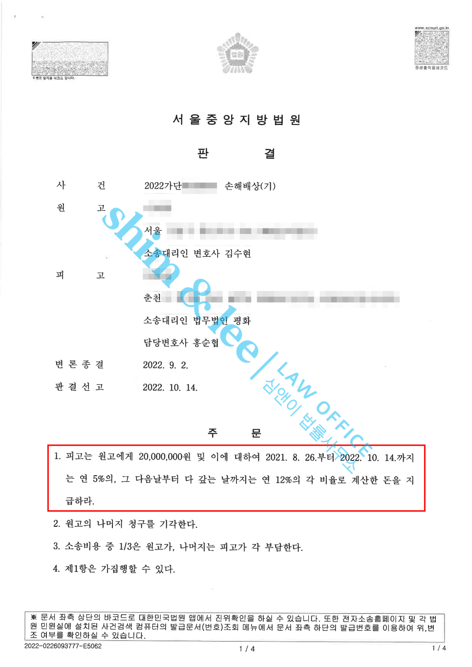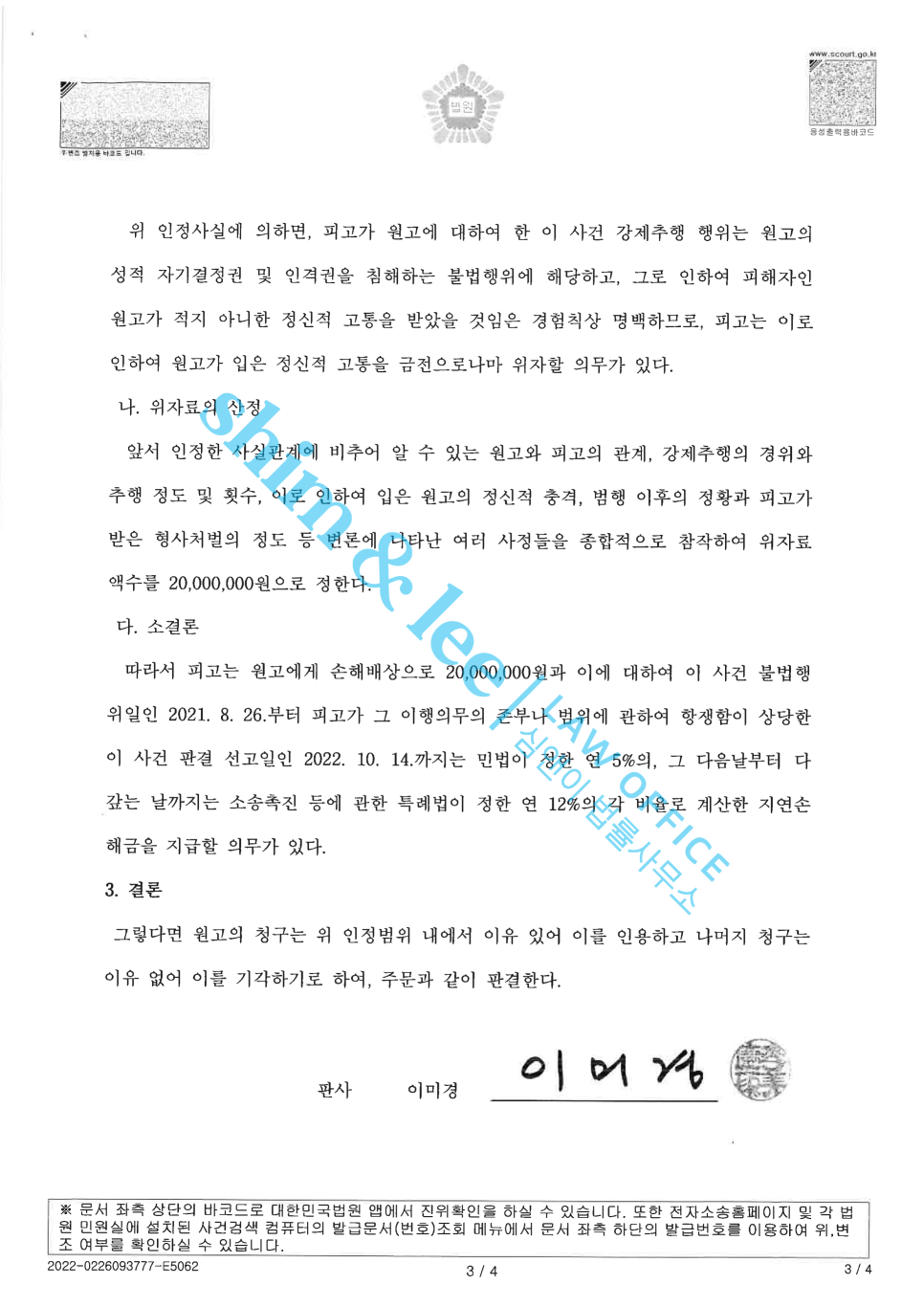 민사 조정에서의 치열한 협상 끝에 가해자에게 2,000만 원의 손해배상액을 받아낼 수 있었습니다. 문제는 손해배상 소송 판결이 2심 재판 선고일보다 먼저라, 가해자가 민사소송에서 손해배상을 해준 것을 가지고 감형 사유로 주장할 것이 뻔한 상황이라는 것이었습니다.