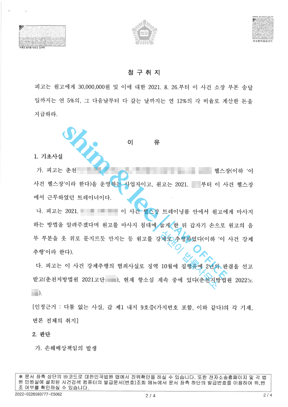 피해자의 회사 대표였던 가해자는 피해자를 회의실로 불러 마사지를 시키고, 피해자에게도 마사지를 해주겠다는 명목으로 피해자의 허벅지와 가슴을 만지며 추행했습니다.