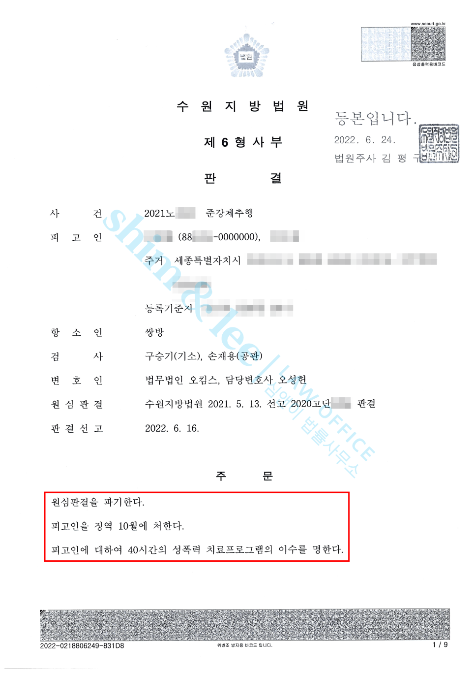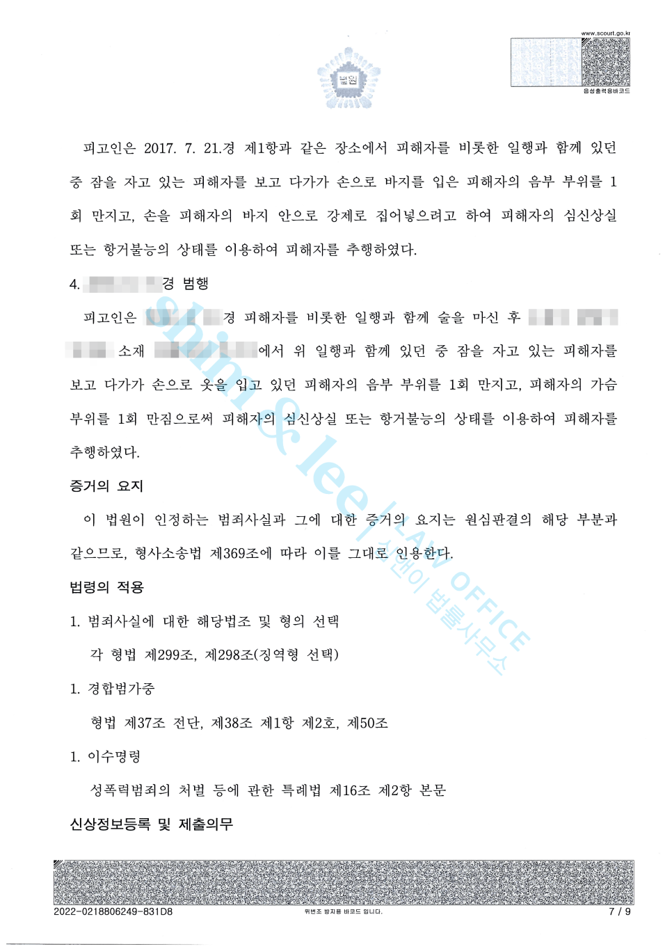 결국 2심 재판부는 죄명을 모두 준강제추행의 기수로 변경하고, 집행유예를 취소하고 무려 징역 10월의 구속 실형으로 변경하는 판결을 선고했습니다.