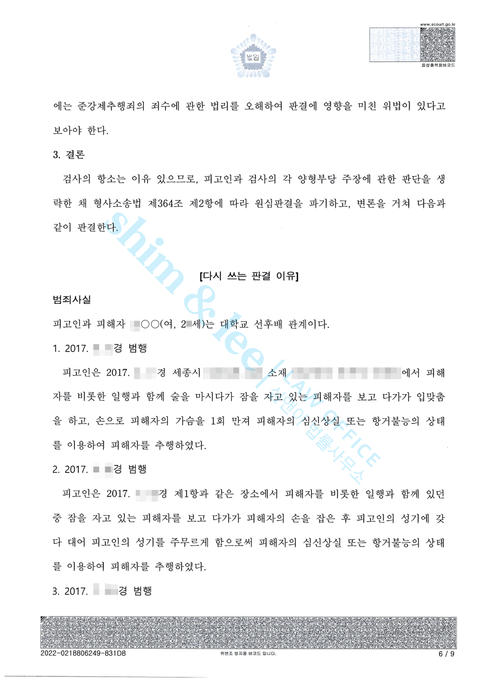 피해자가 잠에서 깬 상태로 계속 추행을 당했다는 점 때문에 1심 재판부가 준강제추행의 기수가 아닌 '불능미수'로 판단하고 감형해준 부분을 법리적으로 반박했습니다. 피해자가 중간에 잠에서 깼더라도 이미 추행이 시작된 상태였고, 그럼 범행이 기수까지 간 것이기 때문에 피해자가 무서워서 반항하지 못했어도 전부 준강제추행의 기수에 들어갈 수 있다는 점을 피해자 변호사 의견서로 자세히 설명했습니다.