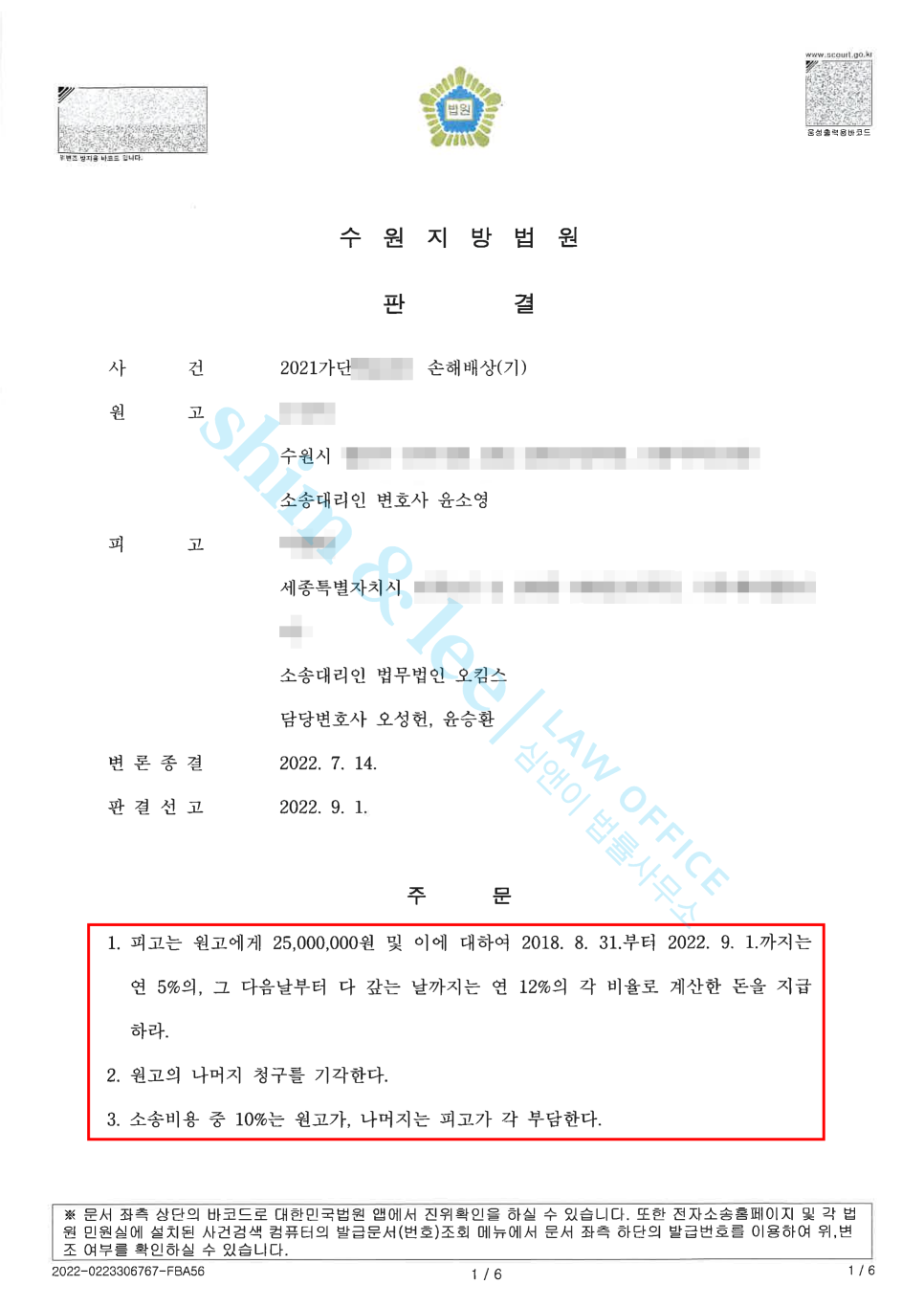 가해자는 이미 구속된 상태라는 점을 이용해서 피해보상을 해주지 않으려고 회피했지만, 심앤이는 가해자 변호사님과의 지속적인 소통과 협의를 통해 원금은 물론 이자와 변호사비용까지 총 3,300만 원 상당의 판결 승소금 전액을 받아냈습니다.