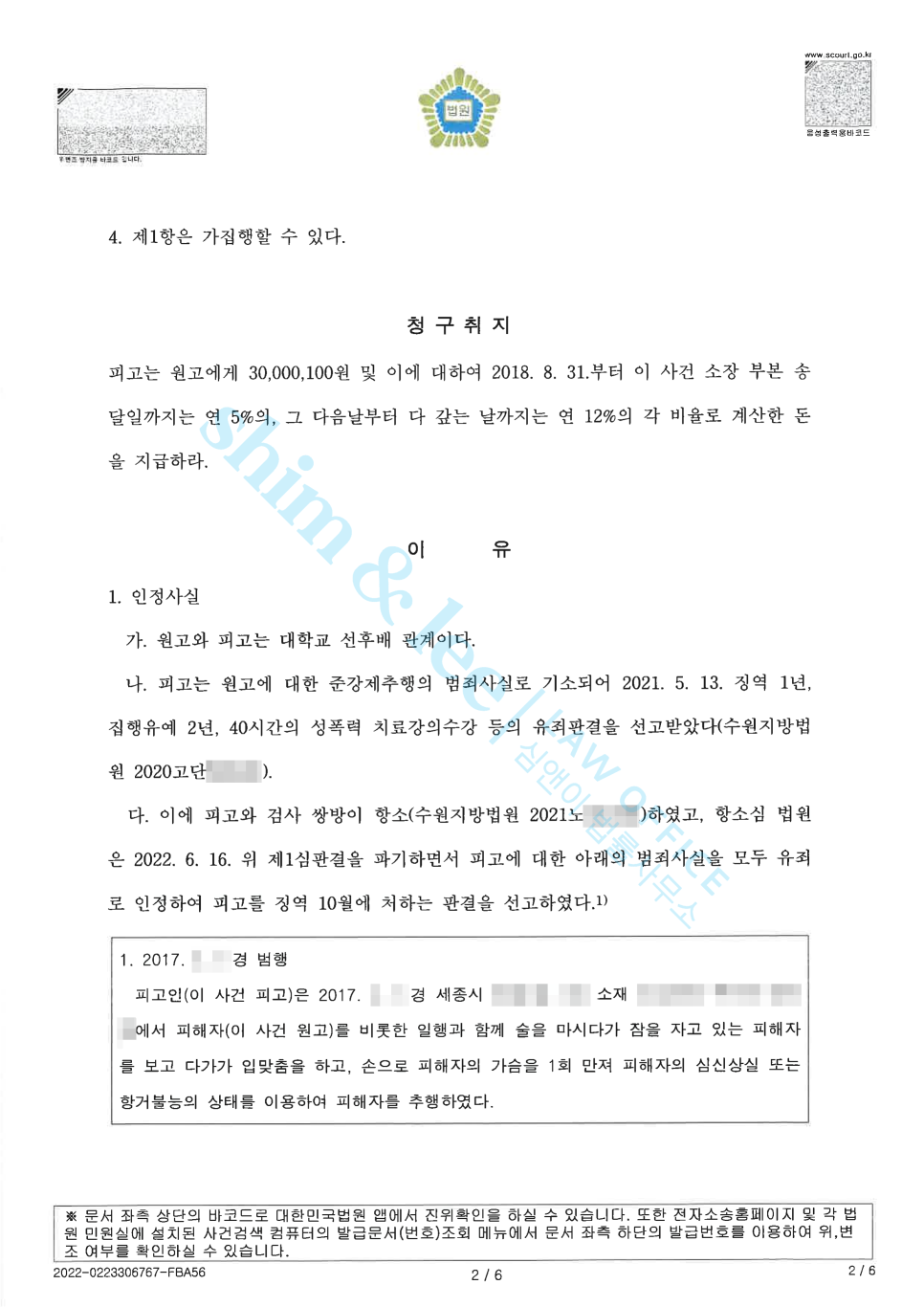 심앤이는 민사소송에서도 높은 형량이 나온 점을 적극적으로 이용했습니다. 결국 추행 사건에서 보기 드문 2천만 원 이상으로, 총 2,500만 원의 위자료 인용판결을 받아냈습니다.