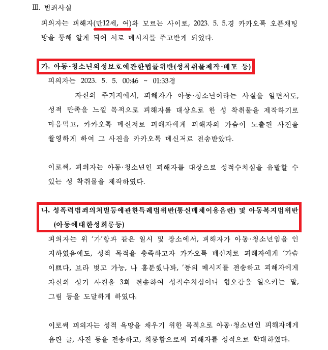 A씨는 B양이 12세 초등학생이라고 소개하였음에도 초등학생이 새벽 시간에 카카오톡 오픈 채팅을 한다는 것은 말이 안 된다는 막연한 생각에 B양과 야한 이야기를 하면서 B양에게 가슴 사진을 촬영하여 전송하라고 요구하였습니다.