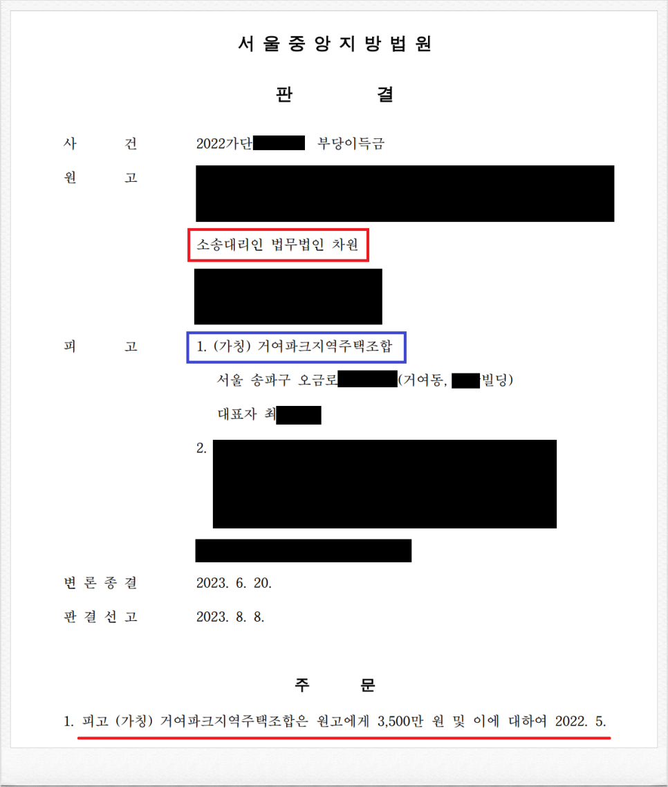 그러나, 가입 후 (가칭)거여파크지역주택조합의 사업이 계획대로 진행되지 않자, 의뢰인은 정식 민사소송을 통하여 조합과 체결한 계약을 취소한 후 기 납입한 금원의 반환을 원하셨습니다.