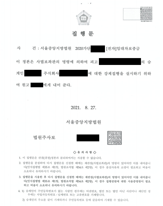 그러나 명의신탁약정 및 그에 따른 등기가 무효인 것은 제3자에게 대항하지 못하며, 의뢰인은 주택임대차보호법상 대항력을 갖추었기에 판결(무변론) 선고 이후의 승계인인 회사에게 위 판결상 보증금반환책임을 청구할 수 있는데, 이 경우 법원에 승계집행문을 신청할 수 있습니다.