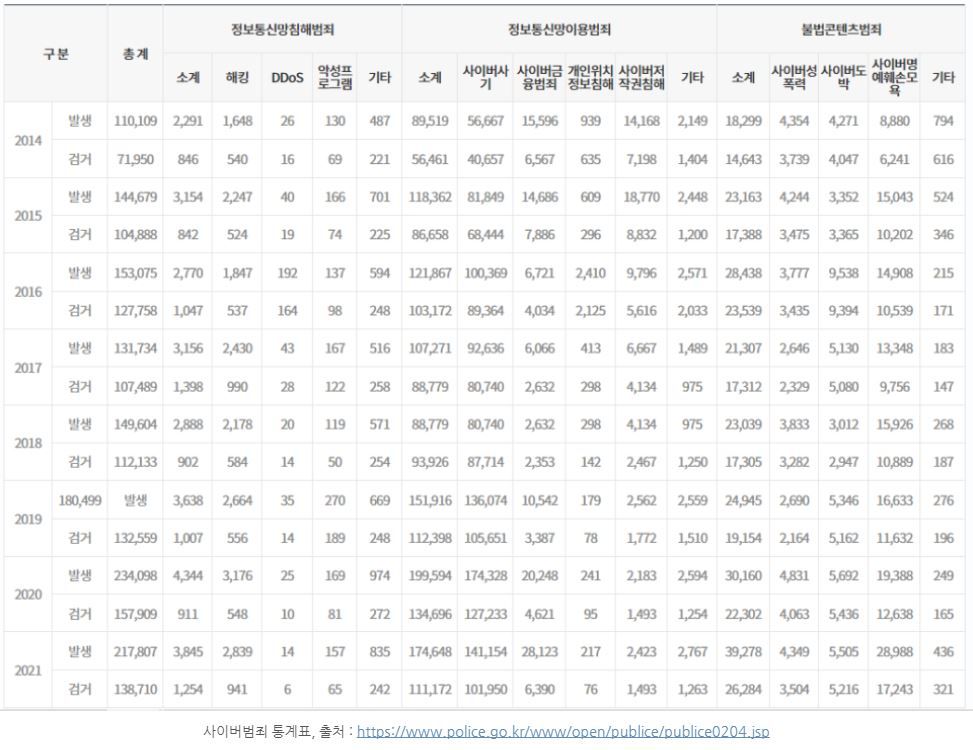 제일 눈에 들어오는 점은 우리가 사이버범죄 중에 제1분야로 뽑고, 전문분야로 가장 널리 알려진 사이버명예훼손, 모욕 분야가 2014년에는 9천건 가량 되던 것이 최근 2021년에는 2만9천건 가량으로 굉장히 빠르게 증가하고 있다는 점이다. 사이버사기(중고거래 사기 등) 유형을 제외하고는 가장 많은 사건수를 자랑하고 있다.. 요즘 인터넷 컨텐츠나 TV프로그램에서도 악플 문제를 많이 다루는 것도 이러한 사회적 행태에 따른 것일 테다.