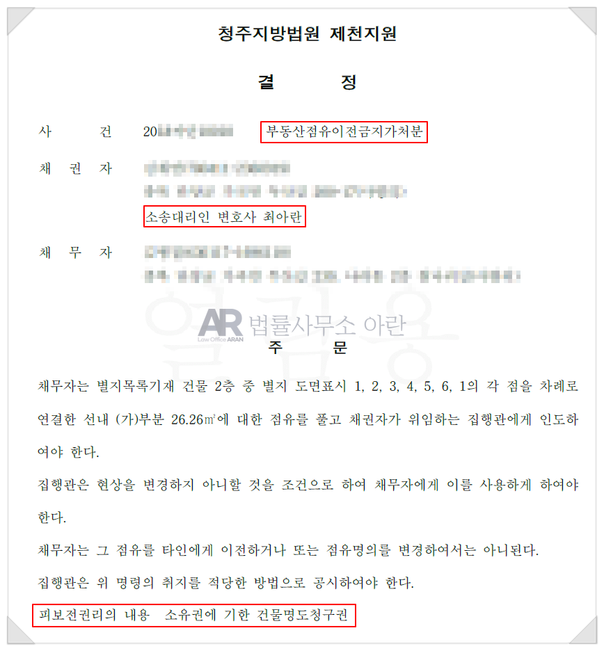 이 사건의 불법점유자들은 소송을 시작하면 다시 또 누구에게 점유를 넘길지 알 수 없는 상태였습니다. 이에 의뢰인은 전입세대 열람 및 인근 주민들의 도움을 받아 불법점유자들의 인적사항을 확인하고, 그들 모두를 상대로 점유이전금지가처분 절차를 진행하였습니다.