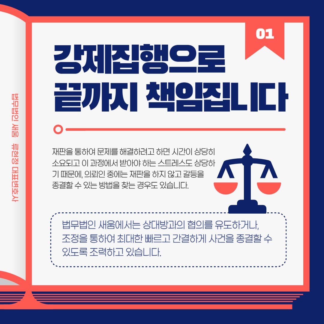 재판을 통하여 문제를 해결하려고 하면 시간이 상당히 소요되고 이 과정에서 받아야 하는 스트레스도 상당하기 때문에, 의뢰인 중에는 재판을 하지 않고 갈등을 종결할 수 있는 방법을 찾는 경우도 있습니다. 이러한 경우 법무법인 새움에서는 상대방과의 협의를 유도하거나, 조정을 통하여 최대한 빠르고 간결하게 사건을 종결할 수 있도록 조력하고 있습니다.