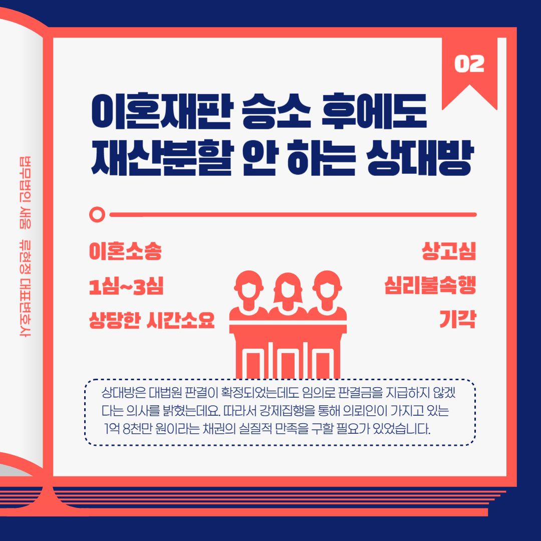 의뢰인은 우리 법무법인에서 이혼 소송을 진행하였습니다. 이혼 소송을 1심부터 3심까지 진행했기 때문에 이 과정에서도 상당한 시간이 필요했고 의뢰인 역시 고통을 겪을 수밖에 없었습니다. 최종적으로 상고심이 심리불속행으로 기각되면서 상대방은 의뢰인에게 재산분할로 1억 8천만 원 상당을 분할해 주어야 한다는 결론이 확정되었습니다. 상대방은 대법원 판결이 확정되었는데도 임의로 판결금을 지급하지 않겠다는 의사를 밝혔는데요. 따라서 강제집행을 통해 의뢰인이 가지고 있는 1억 8천만 원이라는 채권의 실질적 만족을 구할 필요가 있었습니다.