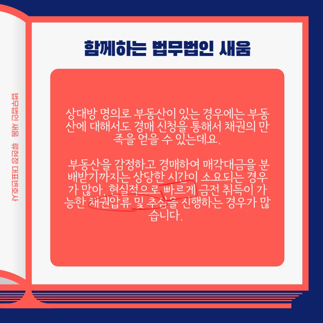 상대방 명의로 부동산이 있는 경우에는 부동산에 대해서도 경매 신청을 통해서 채권의 만족을 얻을 수 있는데요. 부동산을 감정하고 경매하여 매각대금을 분배받기까지는 상당한 시간이 소요되는 경우가 많아, 현실적으로 빠르게 금전 취득이 가능한 채권압류 및 추심을 진행하는 경우가 많습니다.