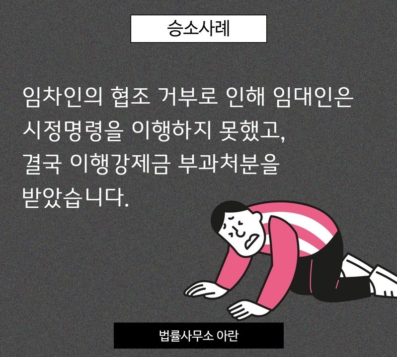 참고로 임차인이 임차목적물을 용도 외로 불법 사용함으로 인해 시정명령이 내려진 경우, 임차인이 협조하지 않아 임대인이 시정명령을 이행하지 못하였다 하더라도 행정청은 임대인에게 이행강제금부과처분을 할 수 있습니다. 다만 임차인이 있어 현실적으로 임대기간 중에 위반내용을 시정하기 어려운 경우에는 이행강제금 감경사유가 될 수 있을 뿐입니다.