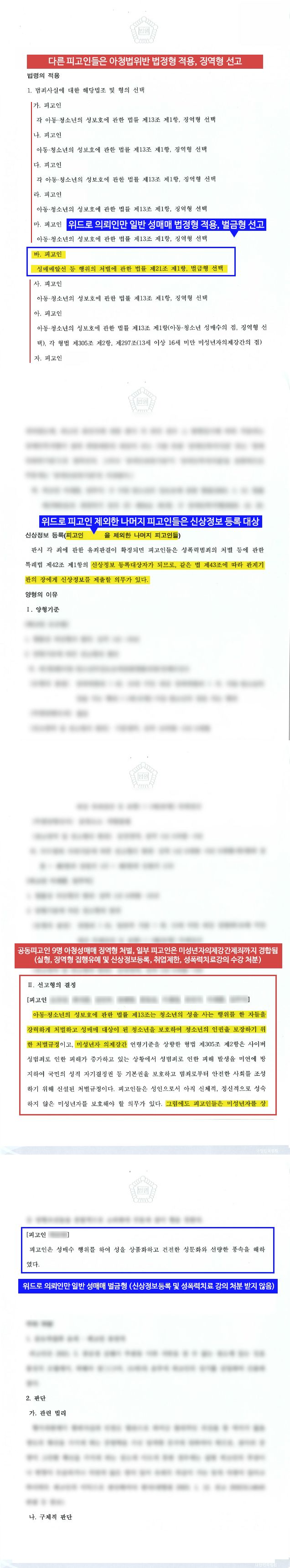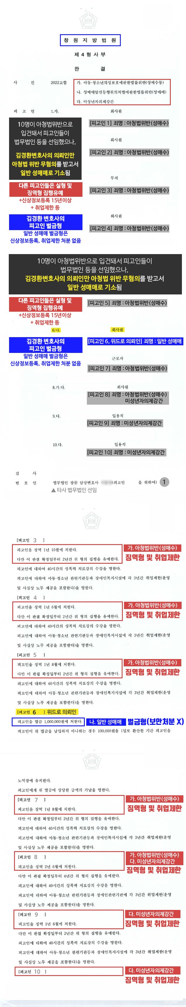 ▶ 의뢰인 외에 공동피고인이 9명이 있고, 위드로 의뢰인을 제외한 다른 피고인들도 다른 법무법인을 선임하였습니다. 그러나 모두 아청성매매로 기소가 되었고, 일부 피고인은 미성년자의제강간죄도 경합되어 기소되었습니다. 다른 피고인들은 아청성매매 징역형 선고와 신상정보등록 및 취업제한명령 등 보안처분도 동반되었습니다.