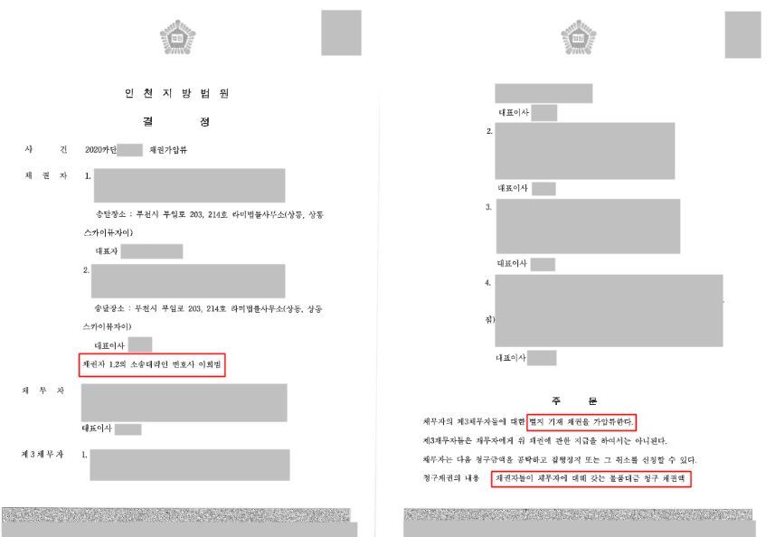 저희 사무실에서는 사건 수임 이후 의뢰인들과의 면담 후에 B회사가 지역 내 백화점 등에 물건을 판매하고 그 물건판매대금 채권을 가지고 있는 것을 파악하였습니다. 실제로 채권자들이 물품대금청구 소송을 통하여 채권을 변제받기 위해서는 오랜 시일이 소요될 뿐만 아니라 그 사이에 채무자가 채권을 수령해 버리거나 처분할 염려가 있기에 재빠르게 지역 내 백화점들을 제3채무자로하여 그 B회사가 물건을 판매하고 이에 따른 차임 및 수수료를 공제한 후 지급 받을 매출대금 채권 중 위 청구금액에 이르기까지의 금액에 대하여 채권 가압류신청을 하였습니다. 채권 가압류의 핵심은 긴급성과 밀행성입니다. 저희 사무실에서는 채권 가압류가 필요한 이유를 소명하여 판사를 설득시켰고 이를 채무자 모르게 비밀리에 은밀하게 진행하였습니다.