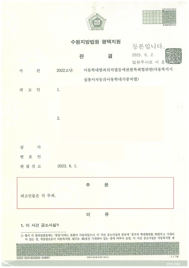 원장님은 참고인 조사로 피의자 전환을 막았고, 선생님들은 기소 후 무죄판결이 나오도록 조력하여 무죄판결이 선고되었습니다.