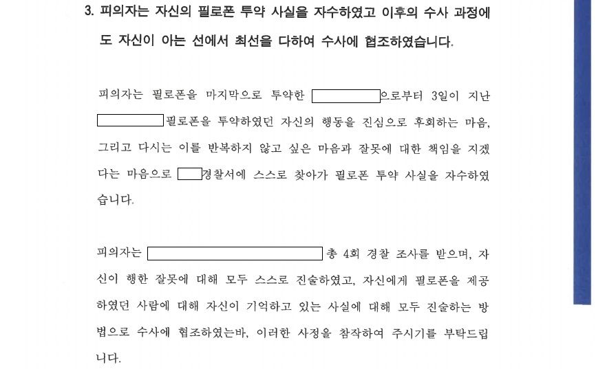 - 저는 의뢰인께서 자수를 결심하신 당일 바로 자수서를 작성하여 자수가 이루어지도록 조치하였고, 이후 4회에 걸쳐 진행된 경찰 수사과정에서 의뢰인분께서 수사에 적극 협조함과 동시에 자신에게 유리한 진술을 명확하게 하실 수 있도록 조력하였으며, 사건이 송치된 이후 의뢰인분께서 주장하실 수 있는 양형사유들을 정리한 변호인 의견서를 담당 검사실에 제출하여 선처를 호소하였습니다.