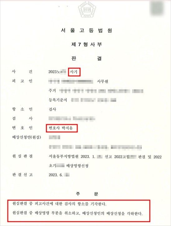 검사가 이에 불복하여 항소하였으나, 1심에서 법정구속을 피한 의뢰인이 사회에서 경제활동을 하며 합의금을 마련하였고, 결국 항소심에서 피해자 전원에 대한 합의를 완료하여 최종적으로 항소 기각되고 배상명령도 취소된, 비교적 간단히 끝난 2심 케이스입니다.
