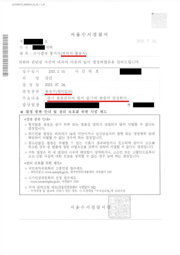 A씨는 혐의없음 불송치 결정을 받았습니다. 불송치 결정을 받으면 검찰단계로 진행되기 전 사건이 종결되고 조속히 일상으로 돌아갈 수 있습니다.