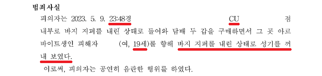 A씨는 심야에 CU편의점에 지퍼를 내린 상태로 들어가 담배를 구매하면서 아르바이트생 19세 여성 B양을 향해 바지 지퍼를 내린 상태로 성기를 꺼내 보였습니다.