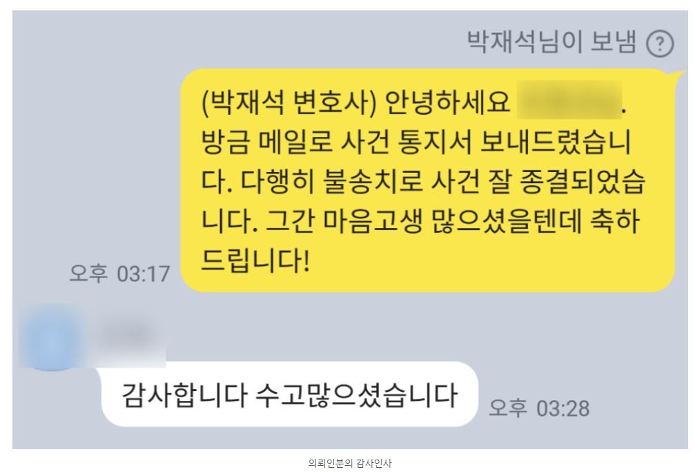조사도 철저하게 준비하여 잘 받았고, 의견서에 법리에 대해 자세히 설명하여 제출한 만큼 수사기관은 조사를 마치고 의견서를 받자마자 곧바로 불송치 결정을 내렸습니다.
