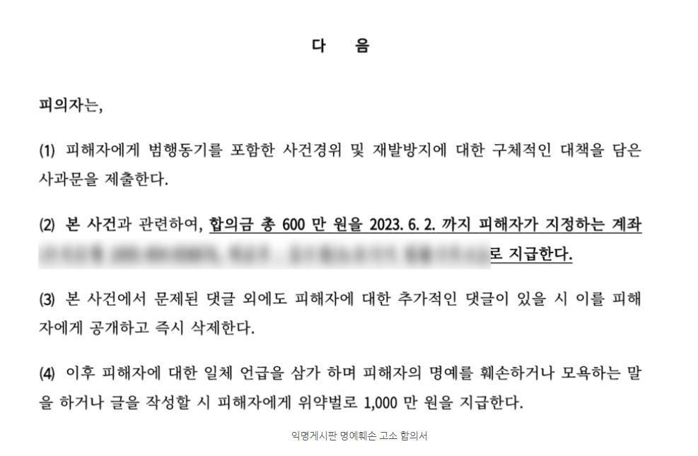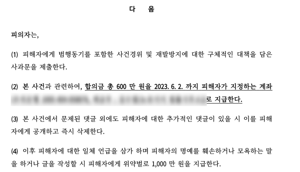 사과문, 합의금 600만 원 피해보상, 재발 방지 등 합의