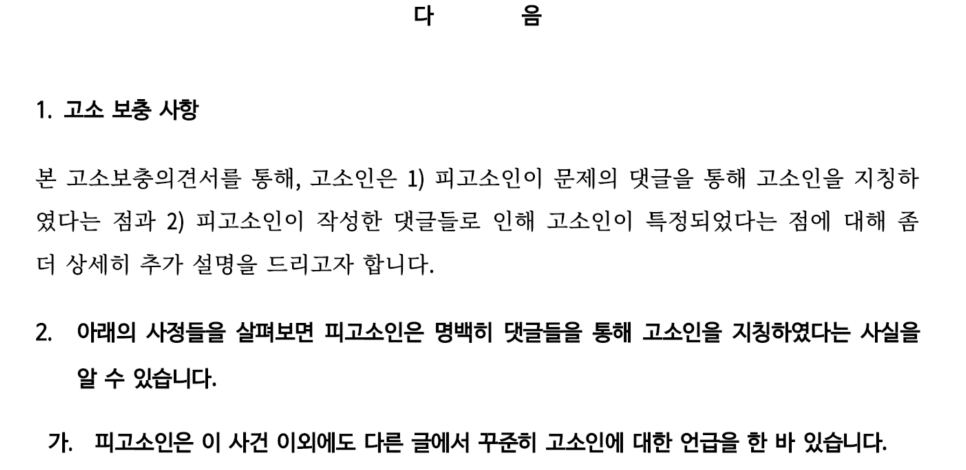다만, 수사기관에서는 저희가 예상한대로 '특정성' 요건을 문제삼았고, 이때부터 저희는 왜 익명게시판 내 게시글이 의뢰인분을 지칭하는 것이라고 볼 수 밖에 없는지 의견서를 통해 상세히 설명하였습니다.