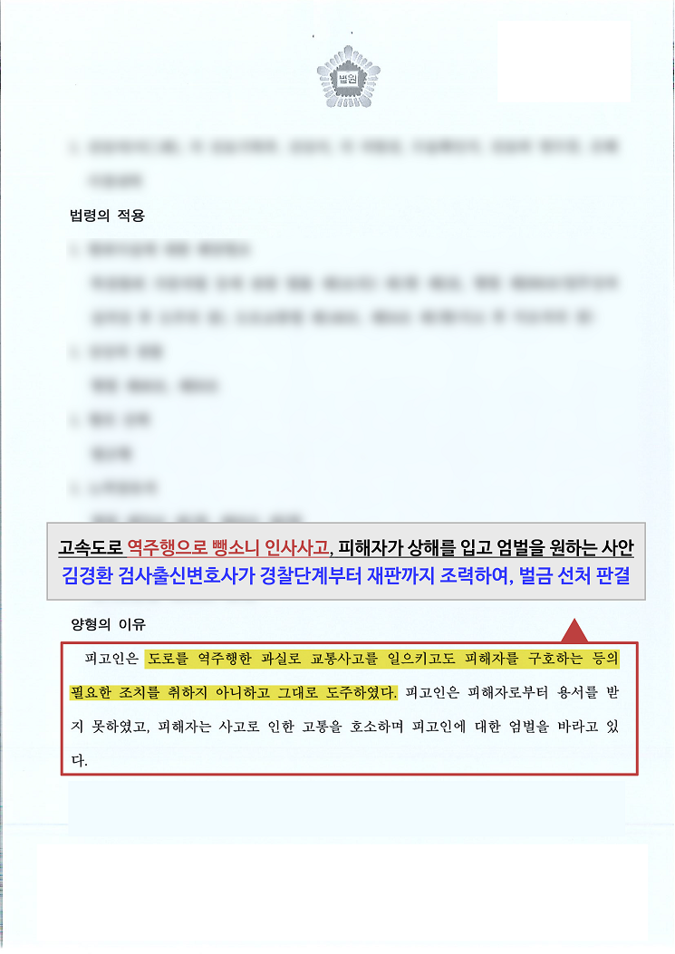 의뢰인은 대기업 회사원으로 재직을 하며 생계를 유지하고 있었고 사건 당일도 업무차 차량을 이용해 도로를 주행하고 있었습니다. 그러던 중 순간 착각을 하여 반대쪽 차선으로 진입(역주행)을 하게 되었고 결국 마주편에서 오던 차량과 접촉사고가 발생하게 되었습니다. 의뢰인은 급한 마음에 보험사가 해당 사건을 처리해 줄 것이라 생각해 별 다른 조치를 취하지 않은 채 현장에서 이탈하게 되었습니다.