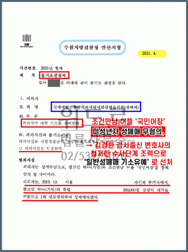 *처분결과 : 미성년자 성매매는 무혐의 / 일반 성매매로 기소유예 선처