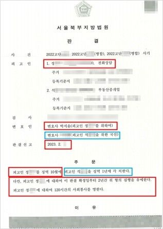 끝으로 강조하고 싶은 부분은, 본 사건의 경우 현금수거를 한 다른 공동피고인도 저희 피고인과 함께 재판을 받았습니다. 하지만 공동피고인은 안타깝게도 저희 의뢰인과는 다르게 법정구속 상태로 재판을 받았고, 피해자들과 합의에 이르지도 못하여 실형을 선고받았습니다. 이처럼 동일한 사건에서도 어떤 변호사를 선임하느냐에 따라 그 결과는 정반대로 나올 수 있기에 만약 보이스피싱 사건에 연루되었다면 보이스피싱 전문 변호사를 선임하는 것은 선택이 아닌 필수입니다.
