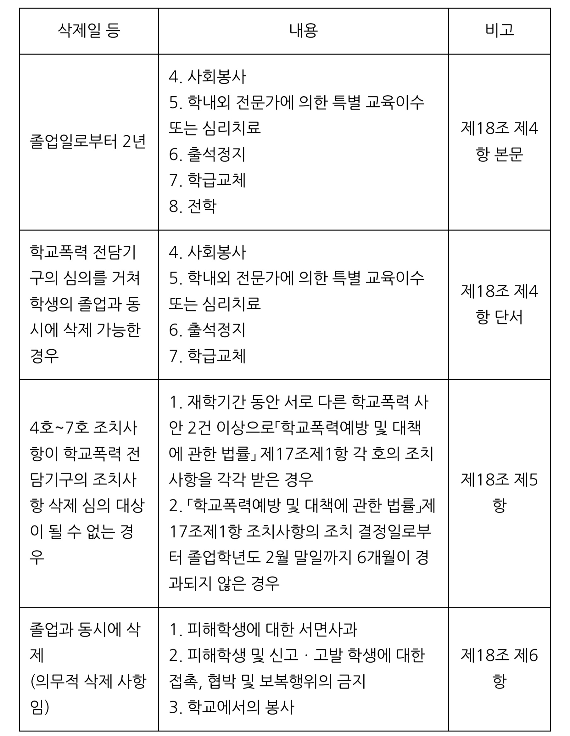2023. 3. 1.을 기준으로 강화되어 졸업과 동시에 삭제되던 것이 졸업일로부터 2년 후 삭제로 되었고 8호 전학조치의 경우 학교폭력 전담기구 심의를 거치더라도 졸업과 동시에 삭제가 되는 길이 막히게 되었습니다.