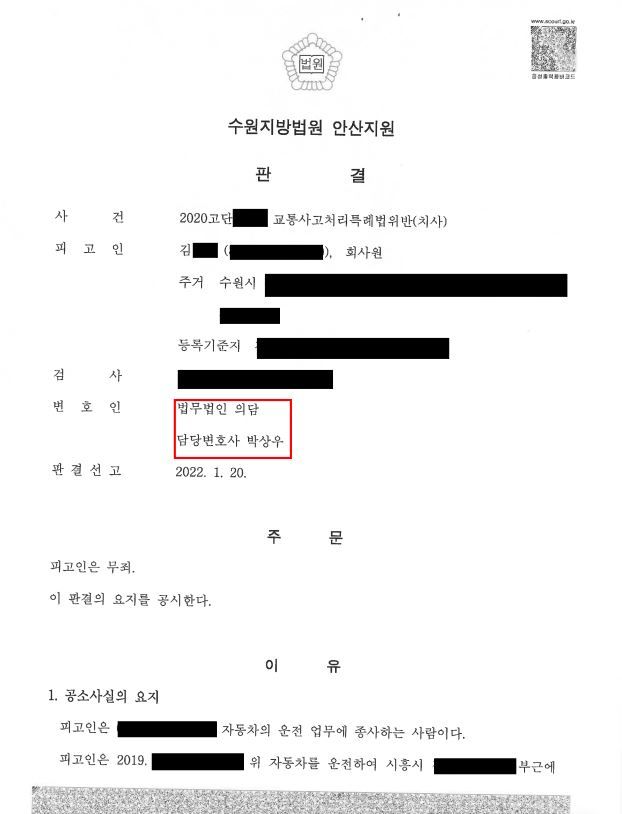 법원은 의뢰인에 대하여 무죄 판결을 선고하였습니다. 박상우 변호사의 변론 내용이 그대로 반영된 결과였습니다. 다행히 의뢰인은 교통사고 사망 사건이라는 중대한 사건에서 원하는 결과를 얻을 수 있었습니다.