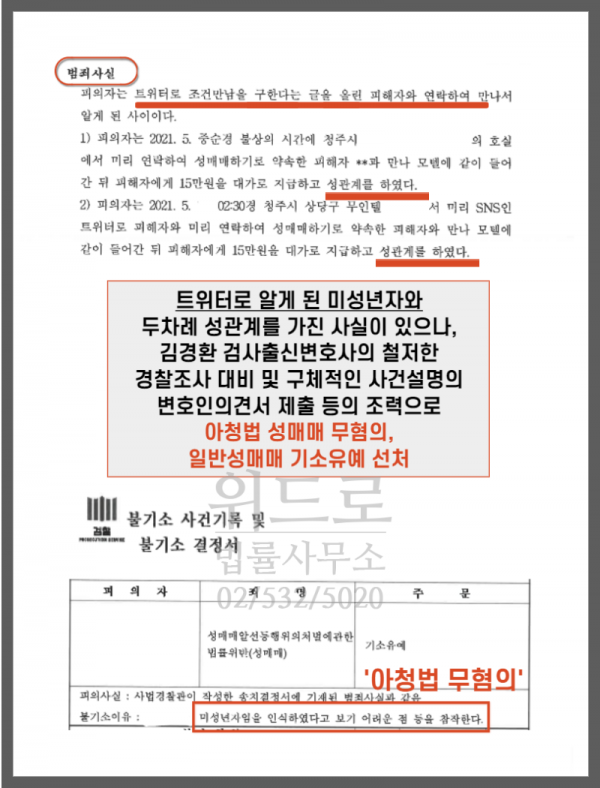 아청법으로는 처벌을 받지 않을 수 있었고, 일반성매매에 대해서도 기소유예로 선처를 받을 수 있었습니다.