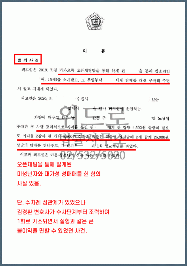 그리고 아청법위반 미성년자 성매매 혐의에 대해서도 여러차례 횟수에서 1회만으로