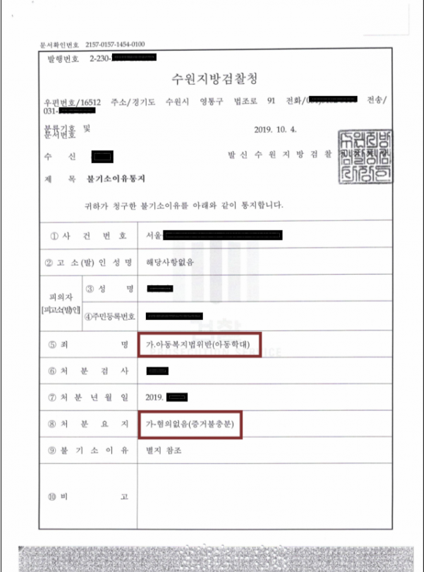 나. 본 사건의 경우 경찰수사단계에서 의뢰인에게 충분한 반론의 기회를 제공하지 않고 추상적으로 아동복지법 위반의 혐의를 인정하여 검찰로 송치한 절차적 잘못이 존재하였습니다. 이에, 운율 형사전문 김신 변호사는 적극적으로 반론의 기회를 제공받고자 수사를 게시해줄 것을 요청하여 불기소 처분을 이끌어 낼 수 있었습니다. 적극적인 수사참여 및 유효적절한 법리적 변호를 통하여 아동학대 혐의로부터 벗어날 수 있었다는 점에 본 처분의 의이가 존재합니다.