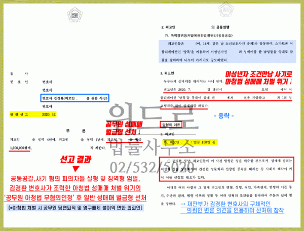 김경환 성범죄전담 검사출신변호사가 경찰조사부터 재판까지 밀착조력하여 아청법이 아닌, 일반성매매로 벌금의 선처를 받았으며 당연퇴직 또한 면할 수 있었던 의뢰인.