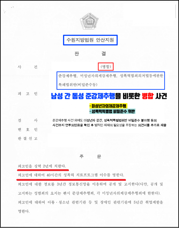 그 결과 수원지방법원 안산지원 재판부는 김경환 성범죄피해 변호사가 제출한 의견서 및 피해사실 증거자료를 검토하고 이를 인정하여, 가해자에 대하여 징역 2년 법정구속을 선고하였습니다. 이에 더해 신상정보 공개 및 고지와 취업제한 5년 처분도 더해졌습니다.