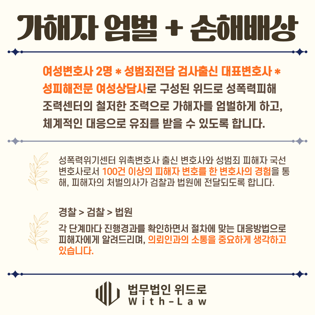 B가 한 행위에 대하여 엄벌이 따를 수 있도록 의뢰인은 김경환 성범죄변호사를 선임하여, 형사고소 절차(피해 진술에 대한 증거자료 및 의견서 제출 등)와 손해배상 민사소송을 진행하였습니다.
