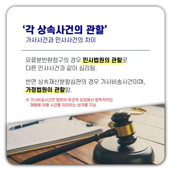 반면 유류분반환청구의 경우 민사법원의 관할로서, 다른 민사사건과 같이 심리됩니다.