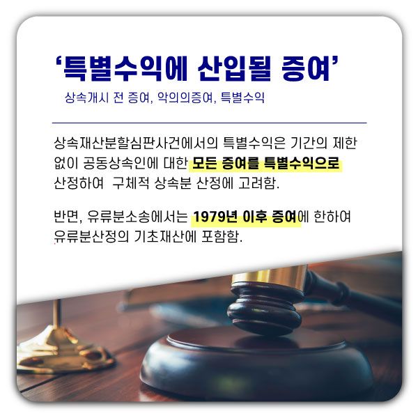 반면, 상속재산분할사건에서 모든 증여는 위 기간의 제한이 없이 특별수익산정에 포함되어 구체적 상속분 계산에 고려됩니다.