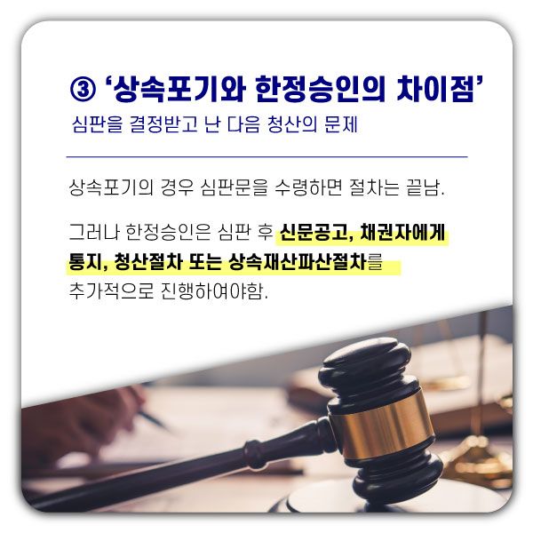 그러나 한정승인의 경우는 한정승인 심판을 받은 이후 5일 내에 한정승인에 대한 신문공고를 하여야 하고, 채권자에게 통지하고, 남는 재산이 있는 경우 채권자들에게 나누어주는 청산절차 또는 상속재산 파산절차를 진행하여야 합니다.