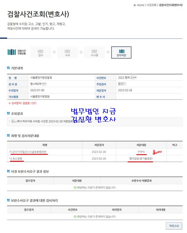이러한 변호인의 의견에 검사님도 수긍을 하여 초소침범죄는 무혐의 처분이 내려졌고 군사기지법 위반은 구약식 처분을 내려주셔서 법정에 가지 않고 사건을 마무리할 수 있었습니다.