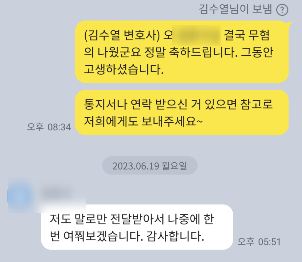 결국, 군검찰 측은 저희가 주장한 내용을 바탕으로 '혐의없음' 처분을 하였고, 의뢰인분과 의뢰인분의 어머니는 결과를 받으시고 너무나도 기뻐하셨습니다.