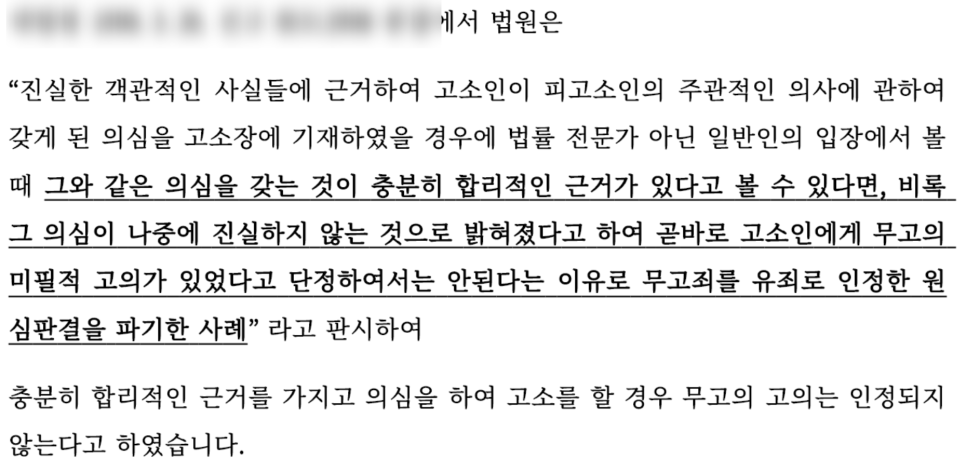 즉, 합리적인 근거를 가지고 범죄의 성립여부를 따져보기 위해 고소를 진행한 경우에는 무고죄가 성립할 수 없는 것입니다.